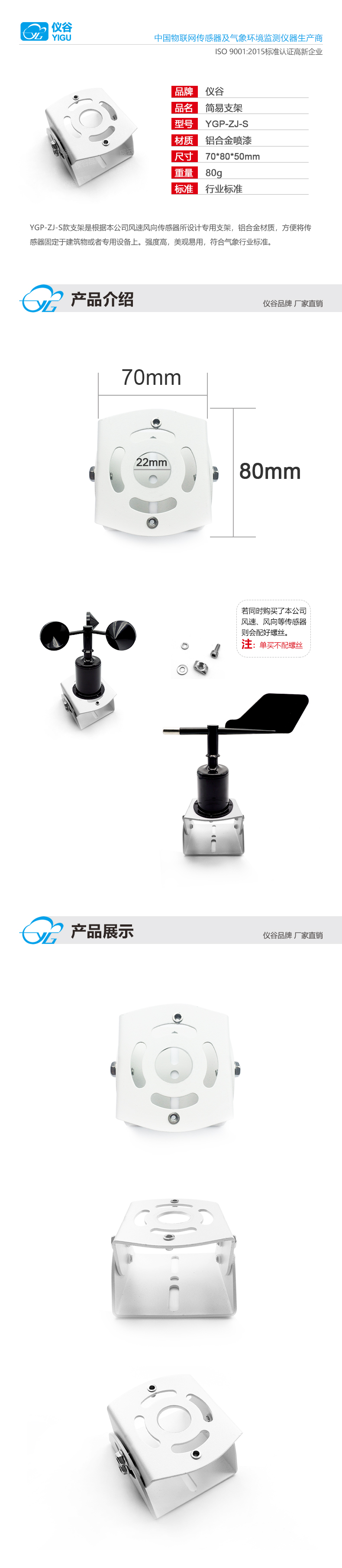 YGP-ZJ-S款支架是根据本公司风速风向传感器所设计专用支架,铝合金材质,方便将传感器固定于建筑物或者专用设备上。强度高,美观易用,符合气象行业标准。